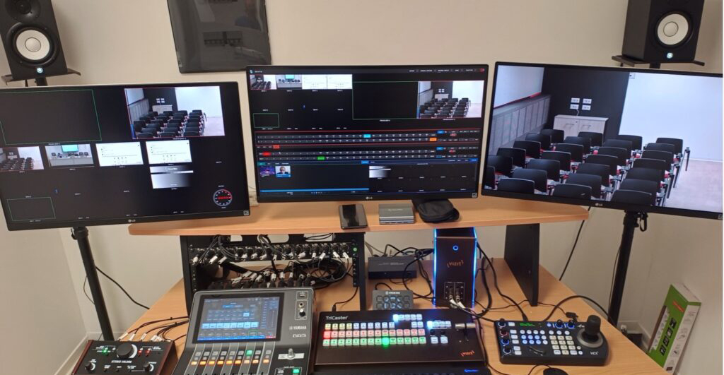 - Audio management through a Yamaha DM3S digital mixer and Sennheiser microphones, including mix-minus for videoconferencing